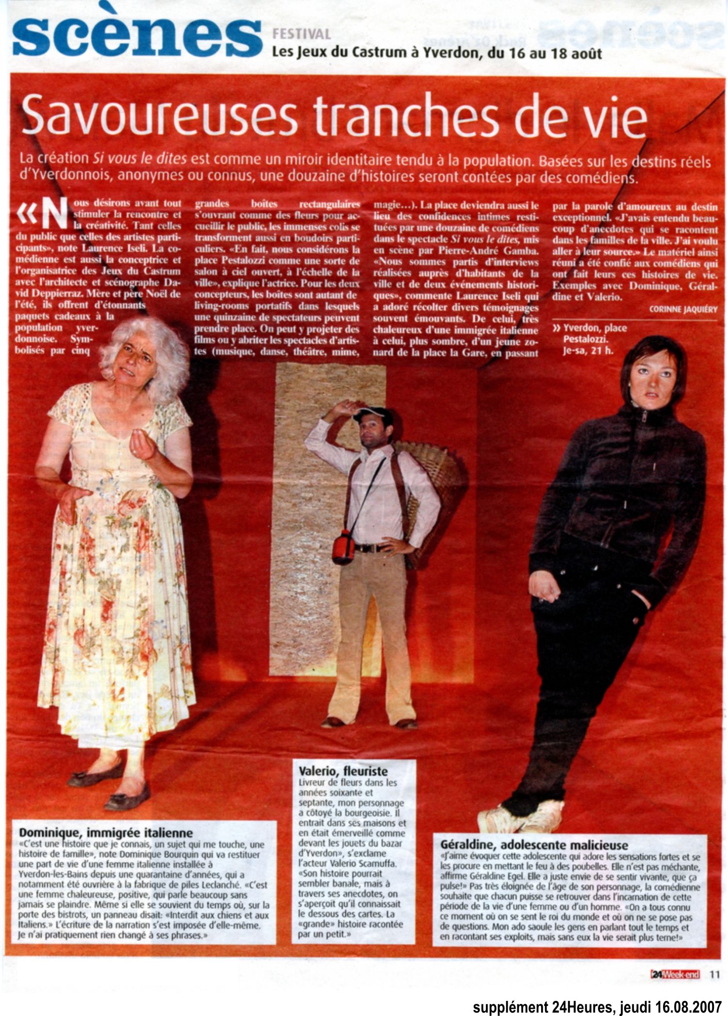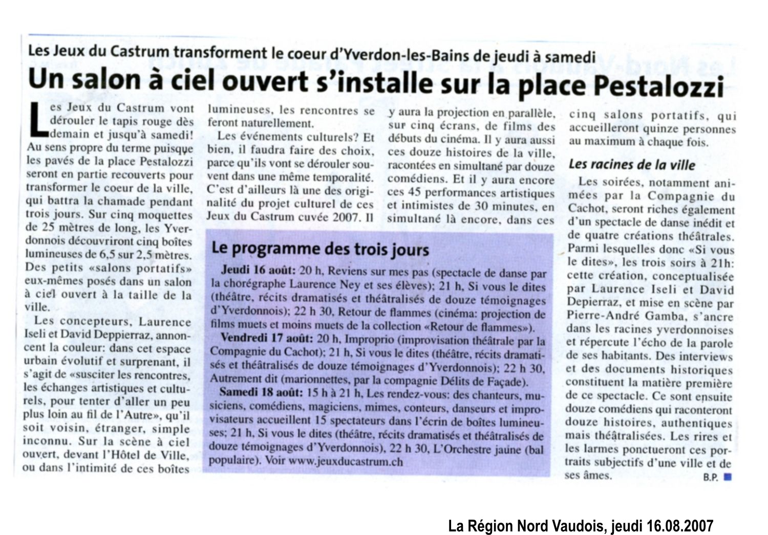 - Si vous le dites..., un spectacle de rue qui s'ancre profondément dans les racines de la cité d'Yverdon-les-Bains et répercute l'écho de la parole de ses habitants. Conception, dramaturgie, scénographie Dahlia Production, mise en scène de Pierre-André Gamba