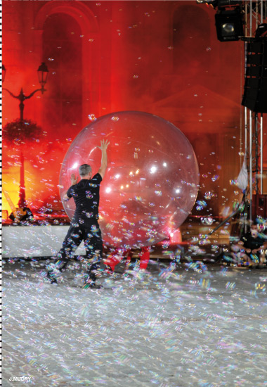 Du chaos initial apparaît une bulle transparente. À l'intérieur évolue une danseuse tout en blanc, Corinne Rochet, de la compagnie Utilité publique.