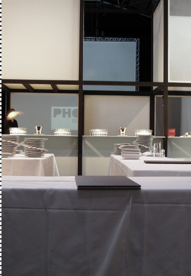 Photos'08 s'est tenu, dans la Halle En construction. Sécheron, amenagée par Dahlia Production en un espace somptueux et convivial, divisé en deux parties par un immense bar qui sert aussi de tour de projection. Noir et blanc, sa prestance et sa hauteur de 6m50 en font l'élément central de la scénographie.