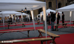 La scénographie est composée de onze petites tentes blanches en tissu. Sous chacune d'elle, un ou une comédienne éclairé par des lampes à pétrole. Quant au public, il se dispose sur trois côtés, assis sur les bancs prévus à cet effet.