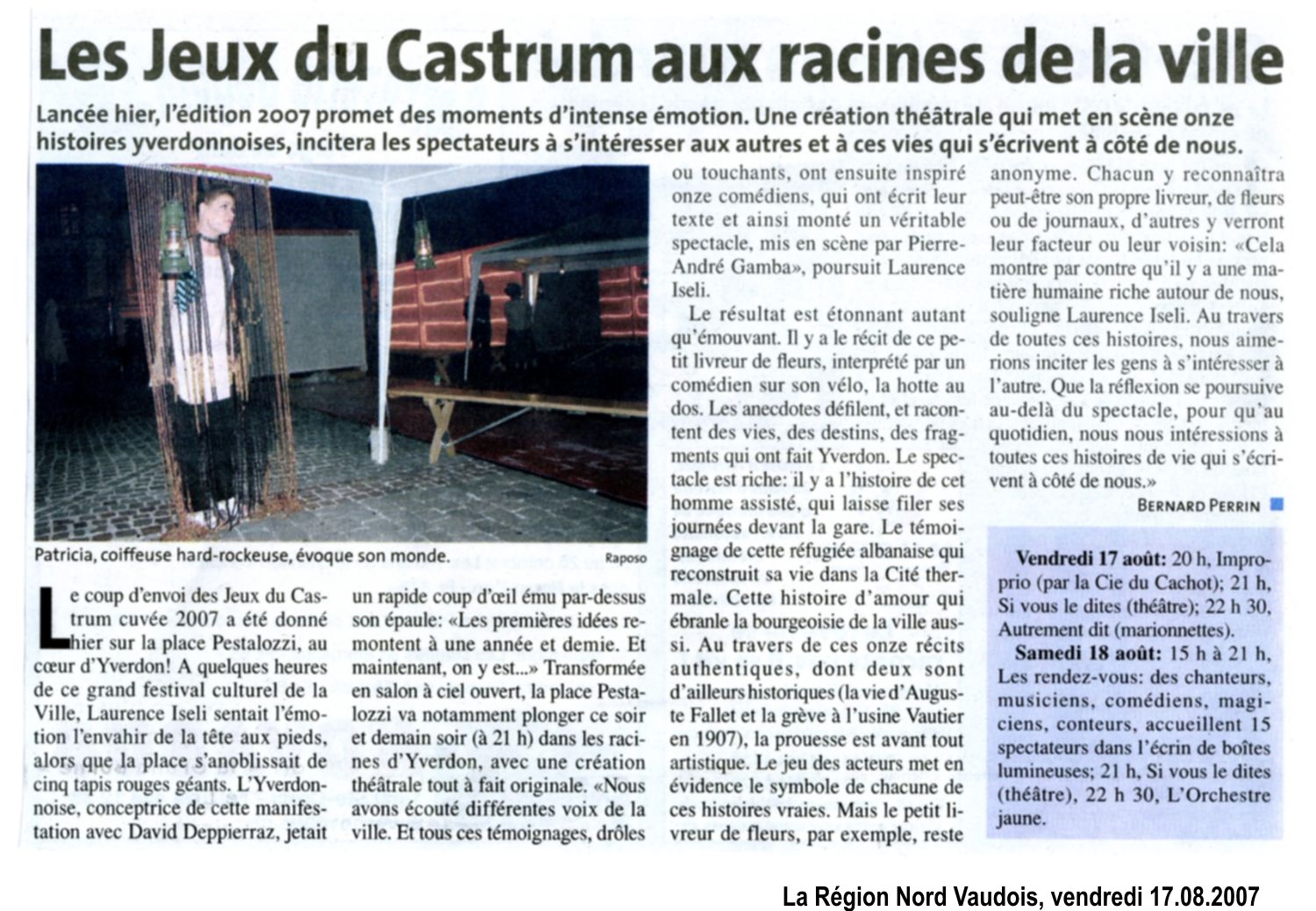 Ce spectacle a été créé à Yverdon-les-Bains mais, sur demande, il peut être adapté à n’importe quelle ville ou région en employant les artistes locaux sous la supervision de Dahlia Production.