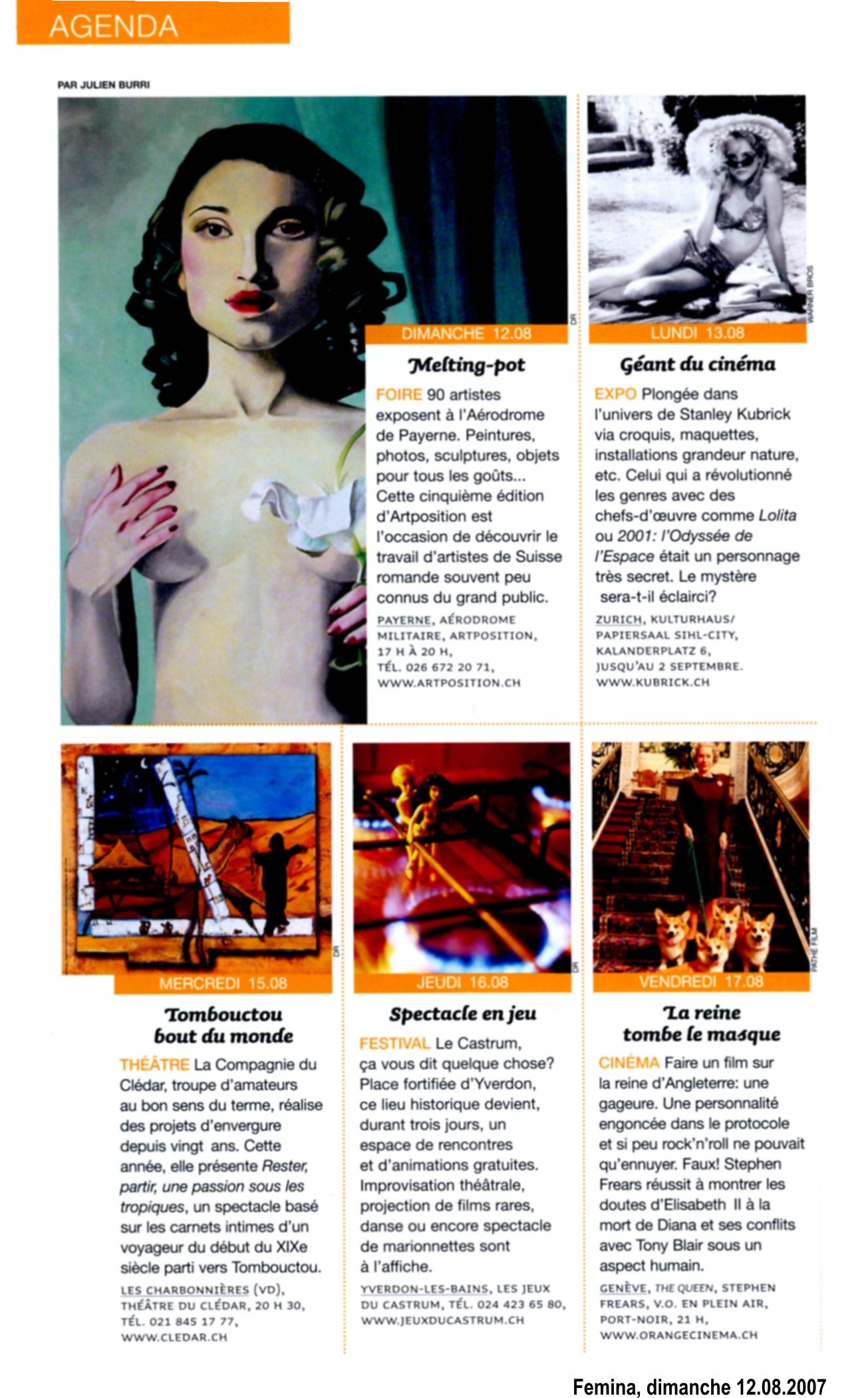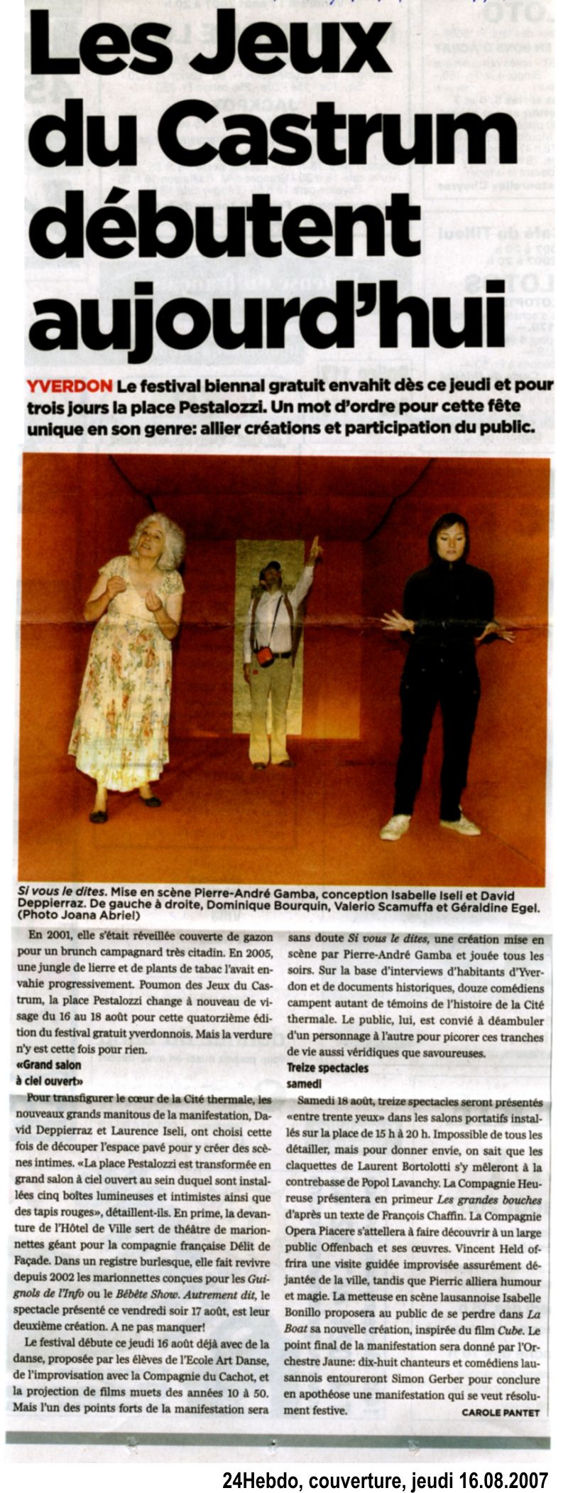 - Si vous le dites..., un spectacle de rue qui s'ancre profondément dans les racines de la cité d'Yverdon-les-Bains et répercute l'écho de la parole de ses habitants. Conception, dramaturgie, scénographie Dahlia Production, mise en scène de Pierre-André Gamba
