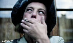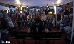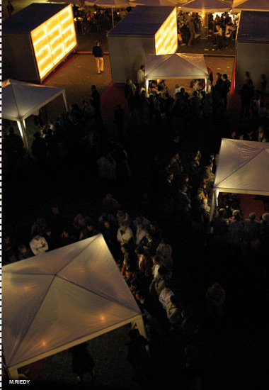 La scénographie est composée de onze petites tentes blanches en tissu. Sous chacune d'elle, un ou une comédienne éclairé par des lampes à pétrole. Quant au public, il se dispose sur trois côtés, assis sur les bancs prévus à cet effet.