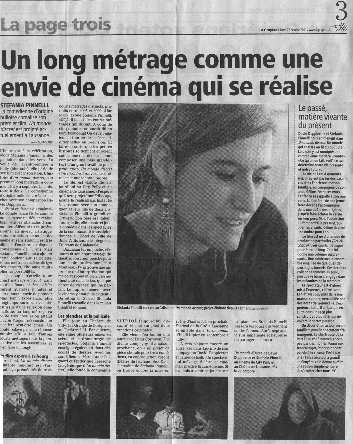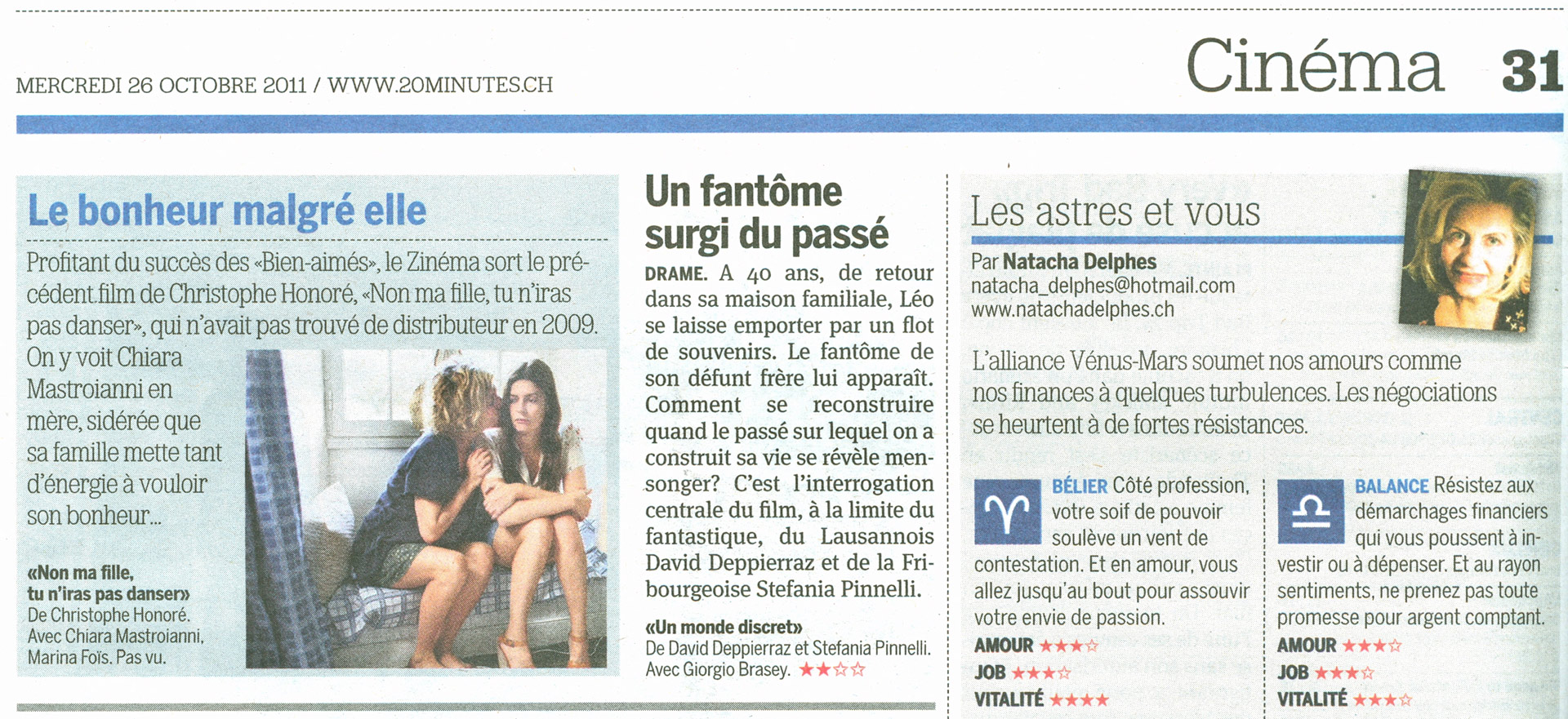 Fiction, HD, 80’, 16/9, Suisse, 2011. Ecrit, produit et réalisé par David Deppierraz et Stefania Pinnelli, coproduit par Dahlia Production, tourné en Suisse romande (Vaud, Valais, Fribourg) en été 2004, été 2006 et automne 2008.